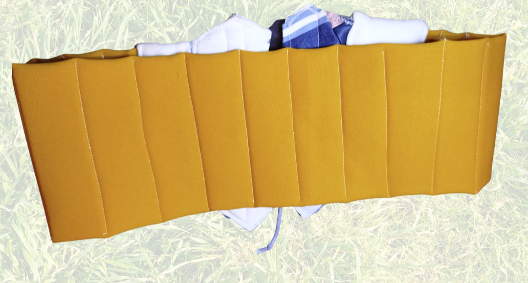 Talla: Cerrado tiene un contorno de 100cm (regulable con el cordón) y 16 cm de ancho.