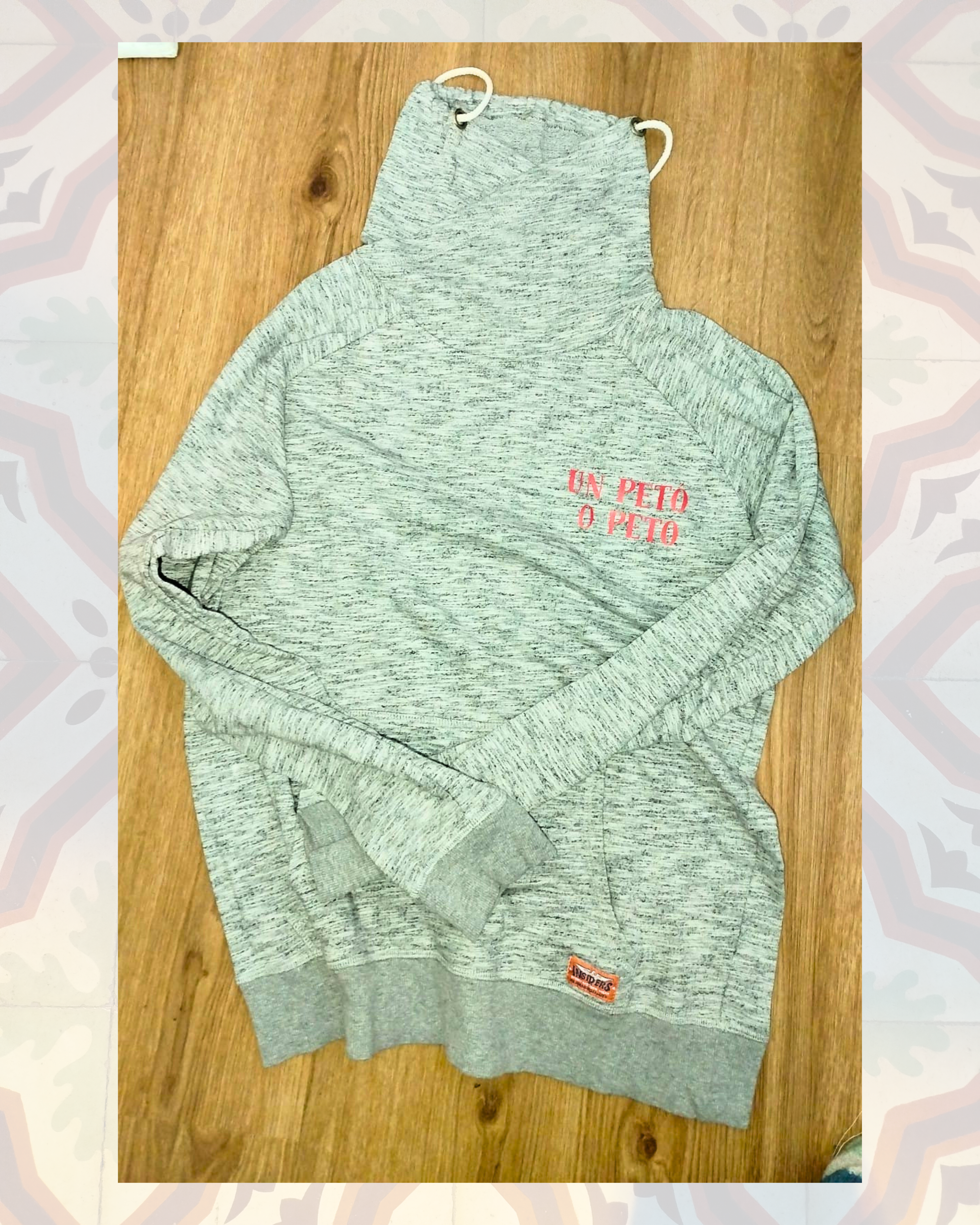 Sudadera sin capucha pero con cuello alto. Ideal para un look casual o para hacer deporte. Está vinilizada por tela de maruja con la frase “petó o peto” (un beso o reviento). Talla: M Medidas: 52 cm de axila a axila y 64 cm de largo.   (Todas las prendas deben de ser lavadas a…